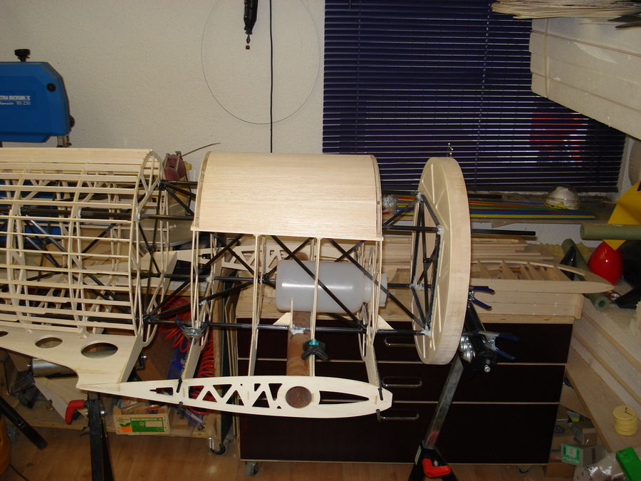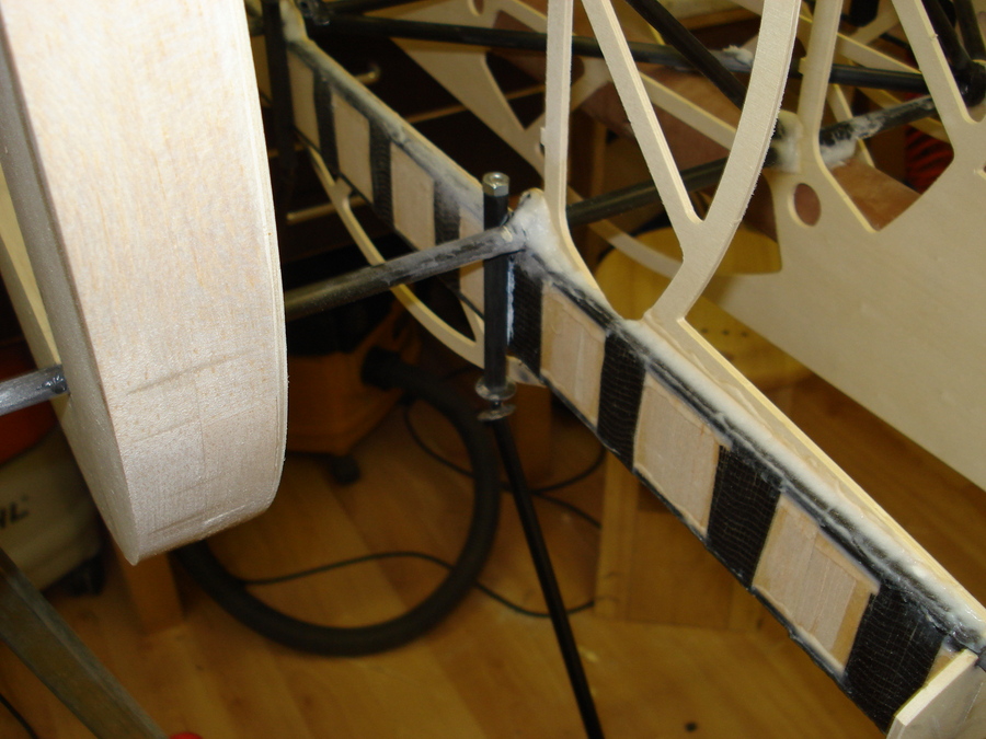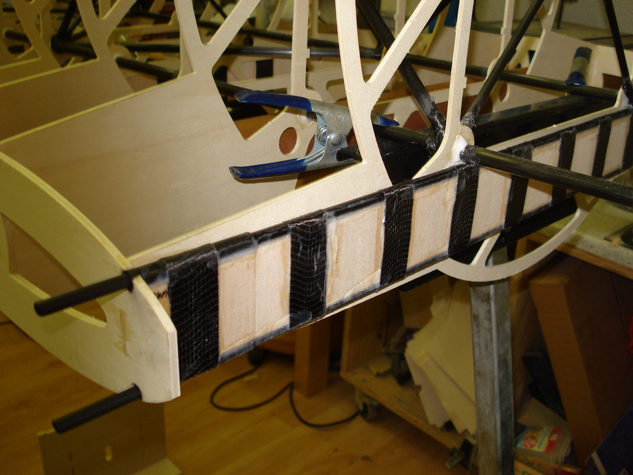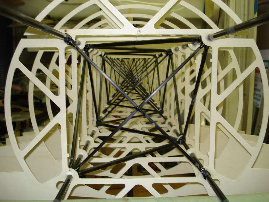 Diagonale Verstrebung des Grundrahmens mit Kohlefaserrohren und anschließen durch Kohlefaserrowingen.