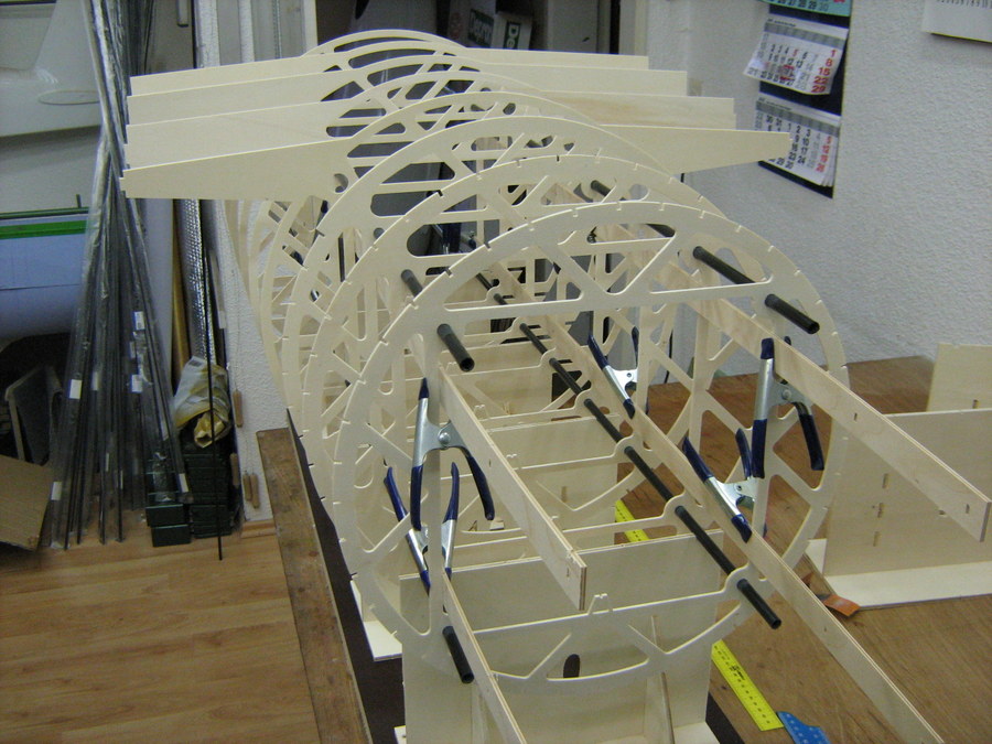 Ausrichten der Heling und auffädeln der Spanten auf den Kohlefaserrohren.